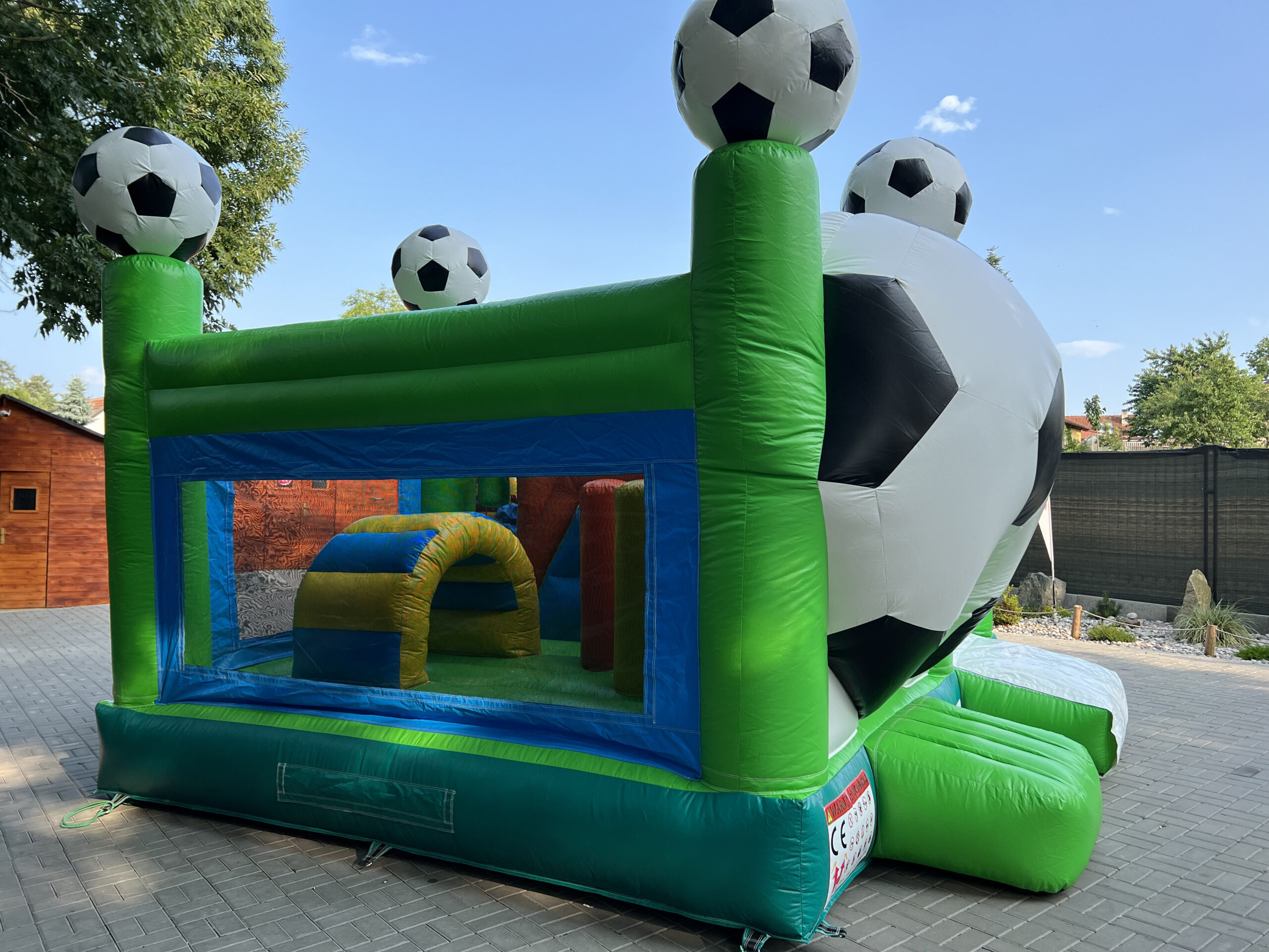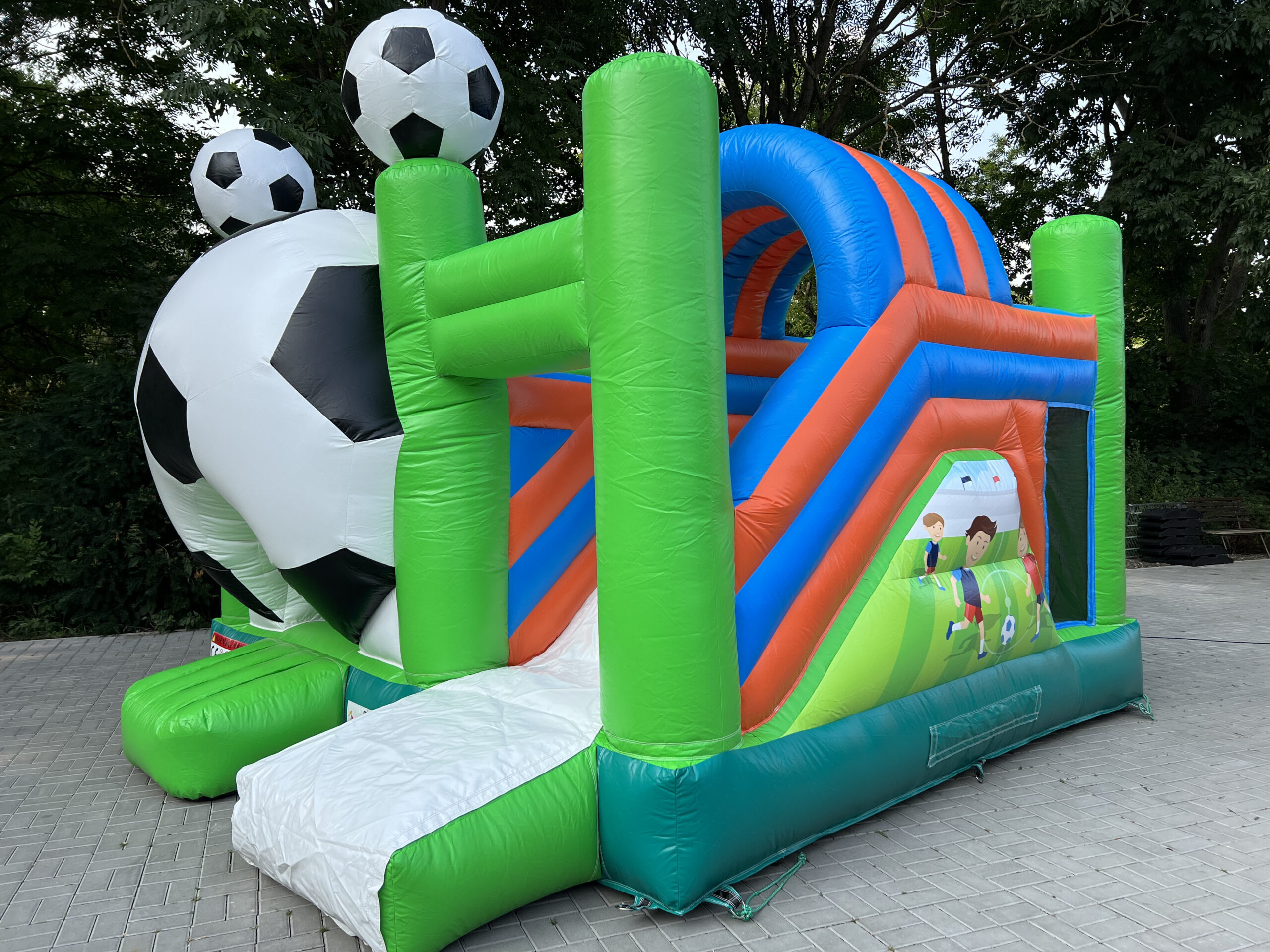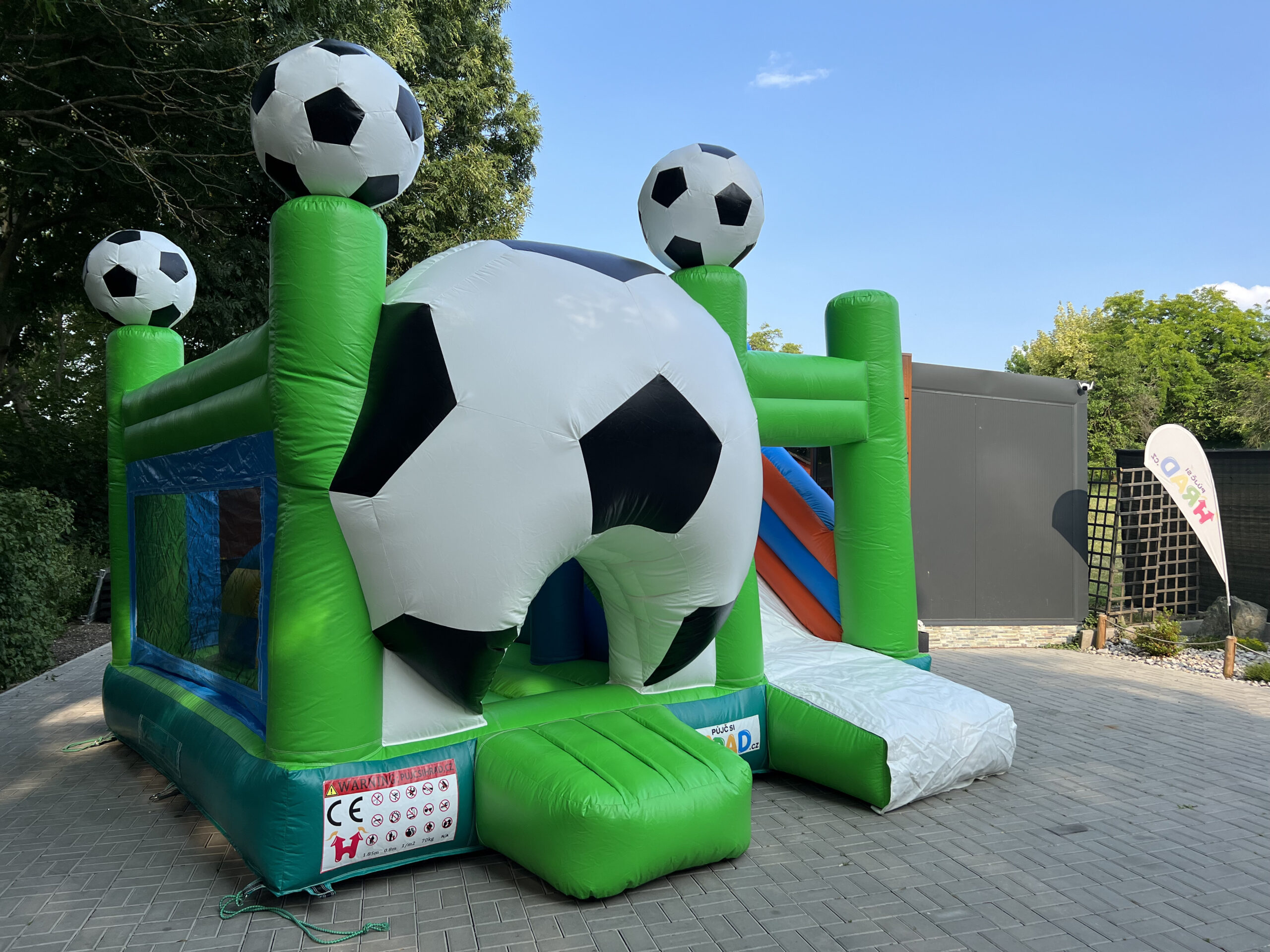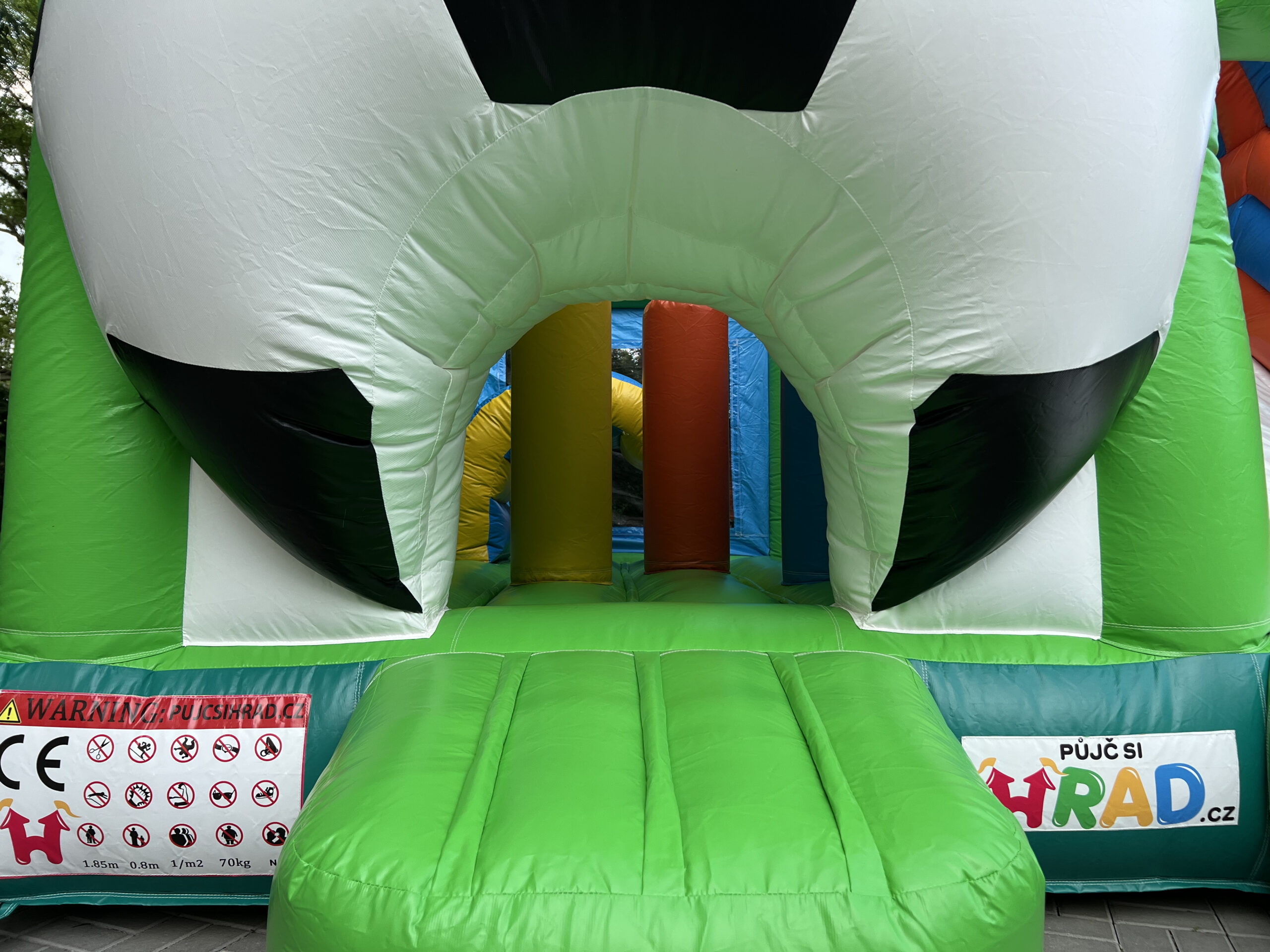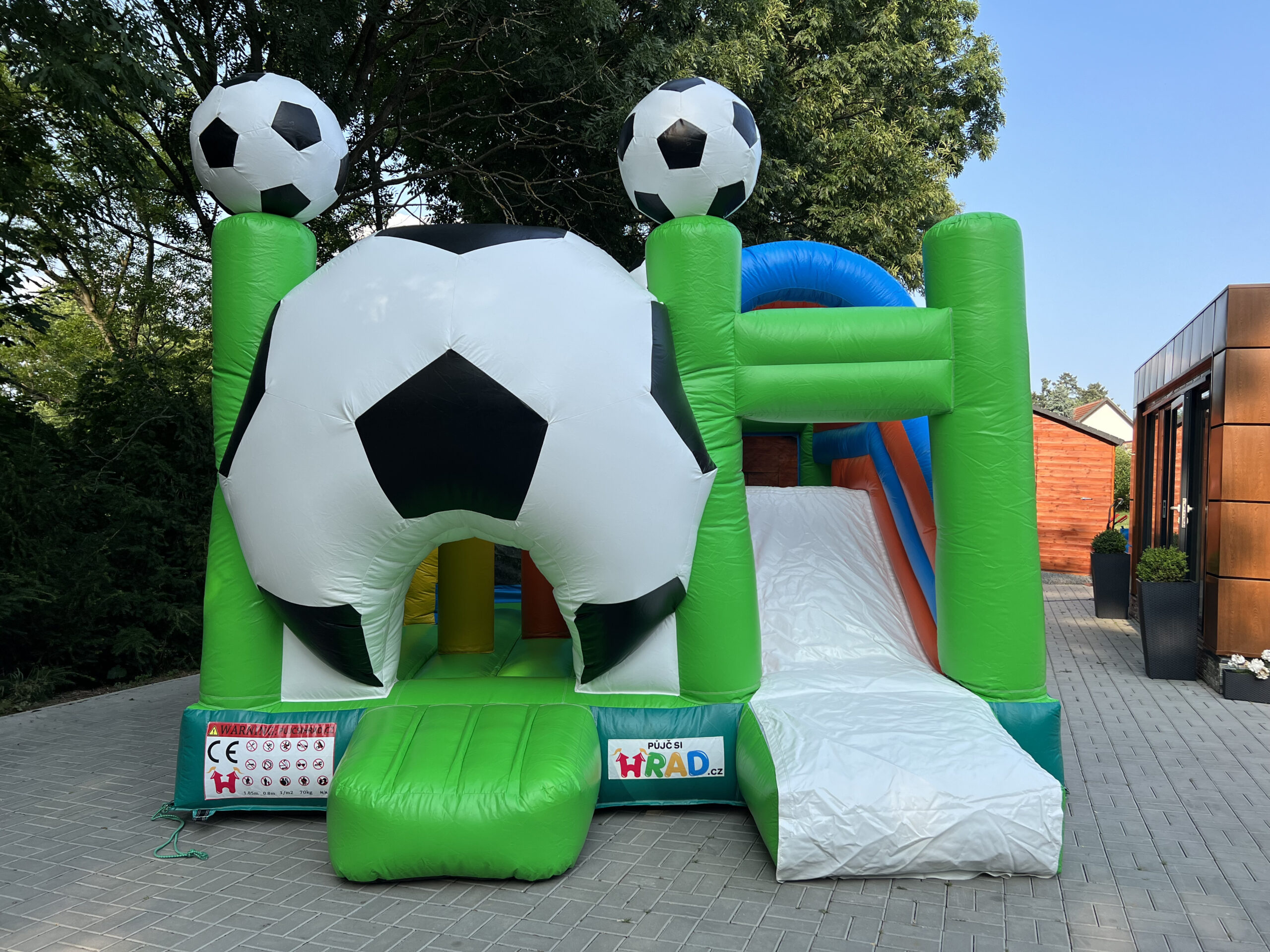 Skákací hrad s fotbalovým motivem, vyrobený ze silného materiálu, proto je vhodný pro děti do 15 let. Součástí je velká skákací plocha s překážkami a velikou skluzavkou.