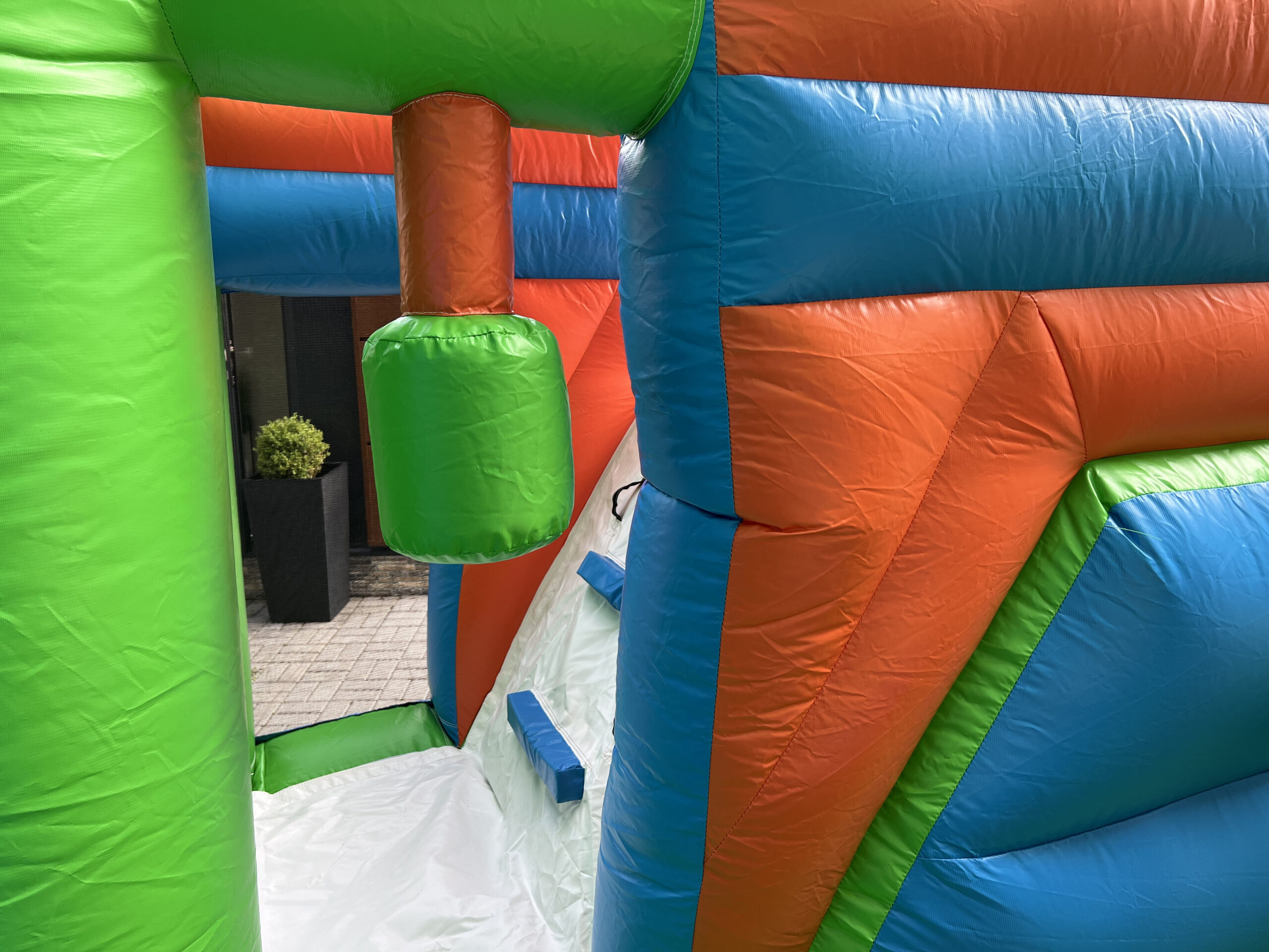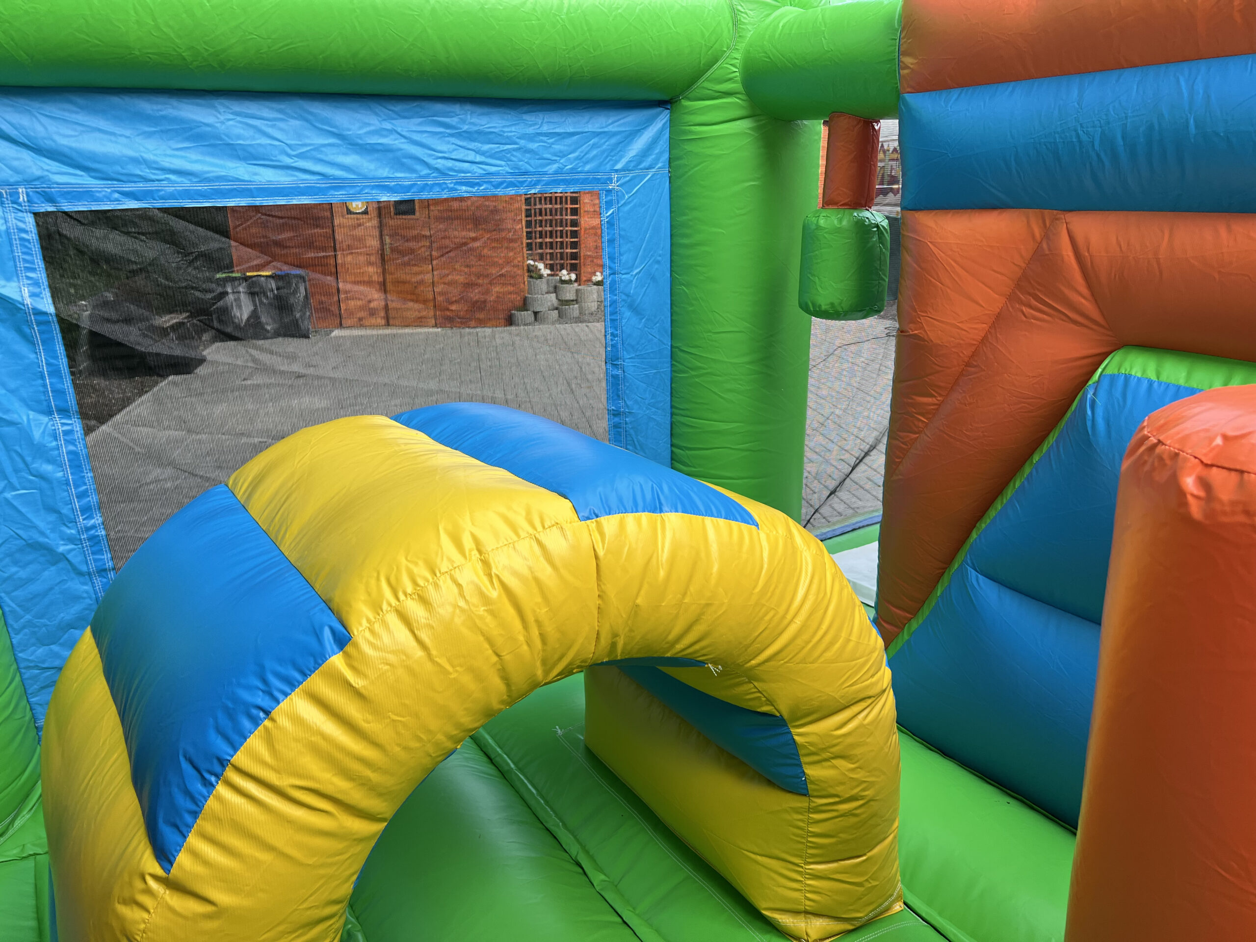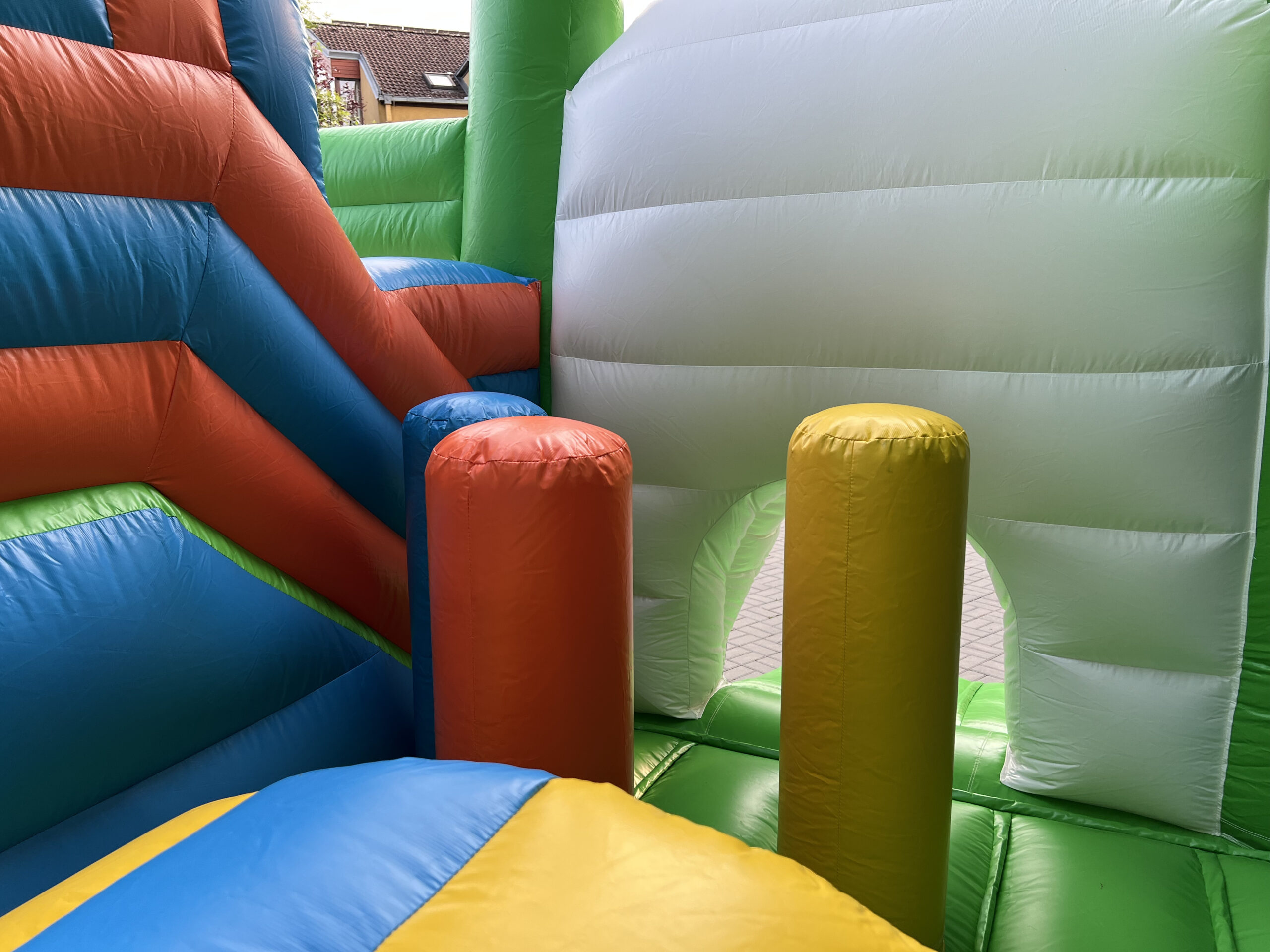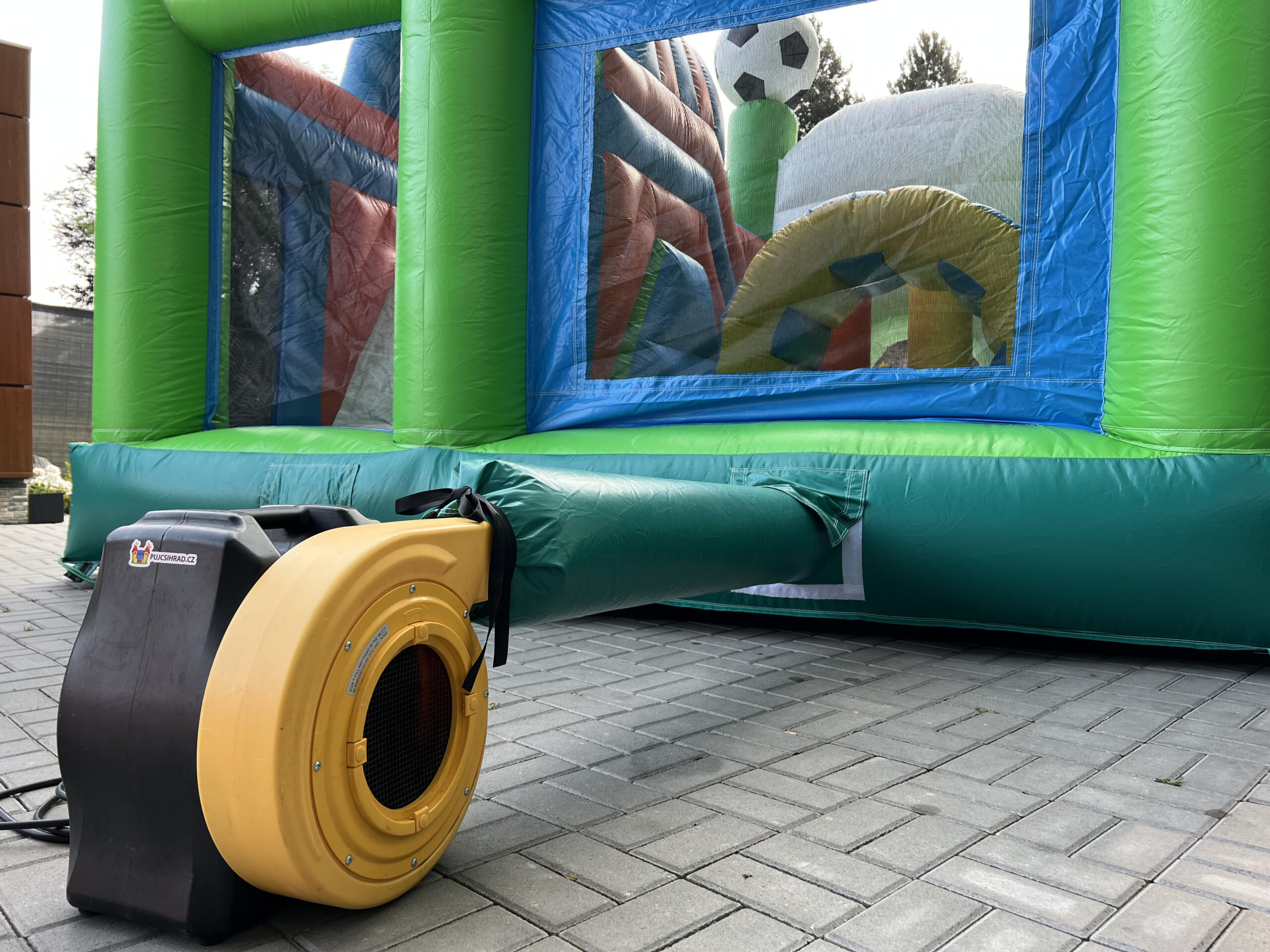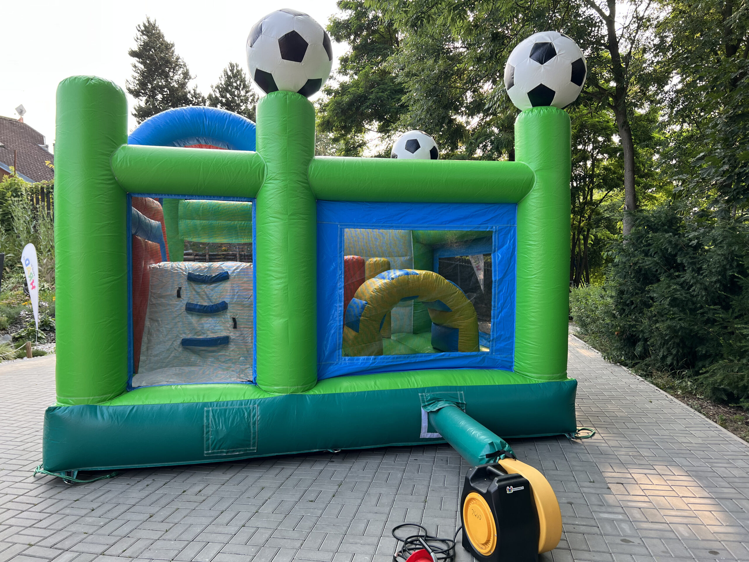 Skákací hrad s fotbalovým motivem, vyrobený ze silného materiálu, proto je vhodný pro děti do 15 let. Součástí je velká skákací plocha s překážkami a velikou skluzavkou.