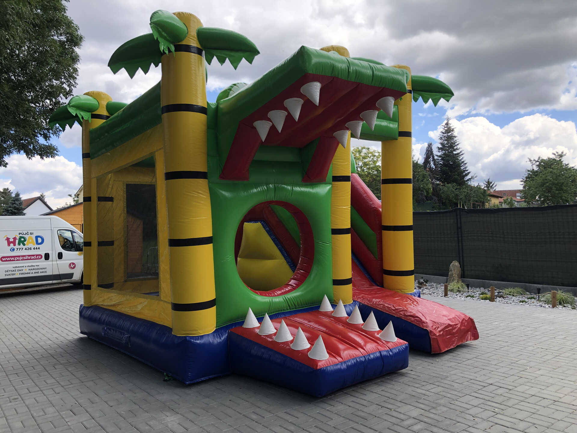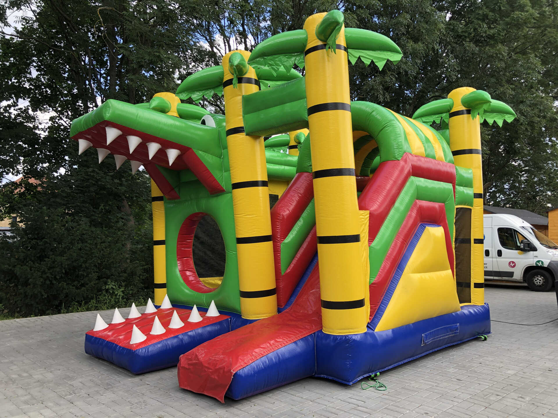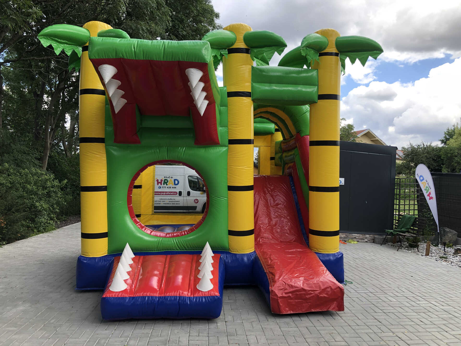 Originální skákací hrad s motivem krokodýla, vyrobený ze silného materiálu, proto je vhodný pro děti do 15 let. Součástí je velká skákací plocha s překážkou a velikou skluzavkou.