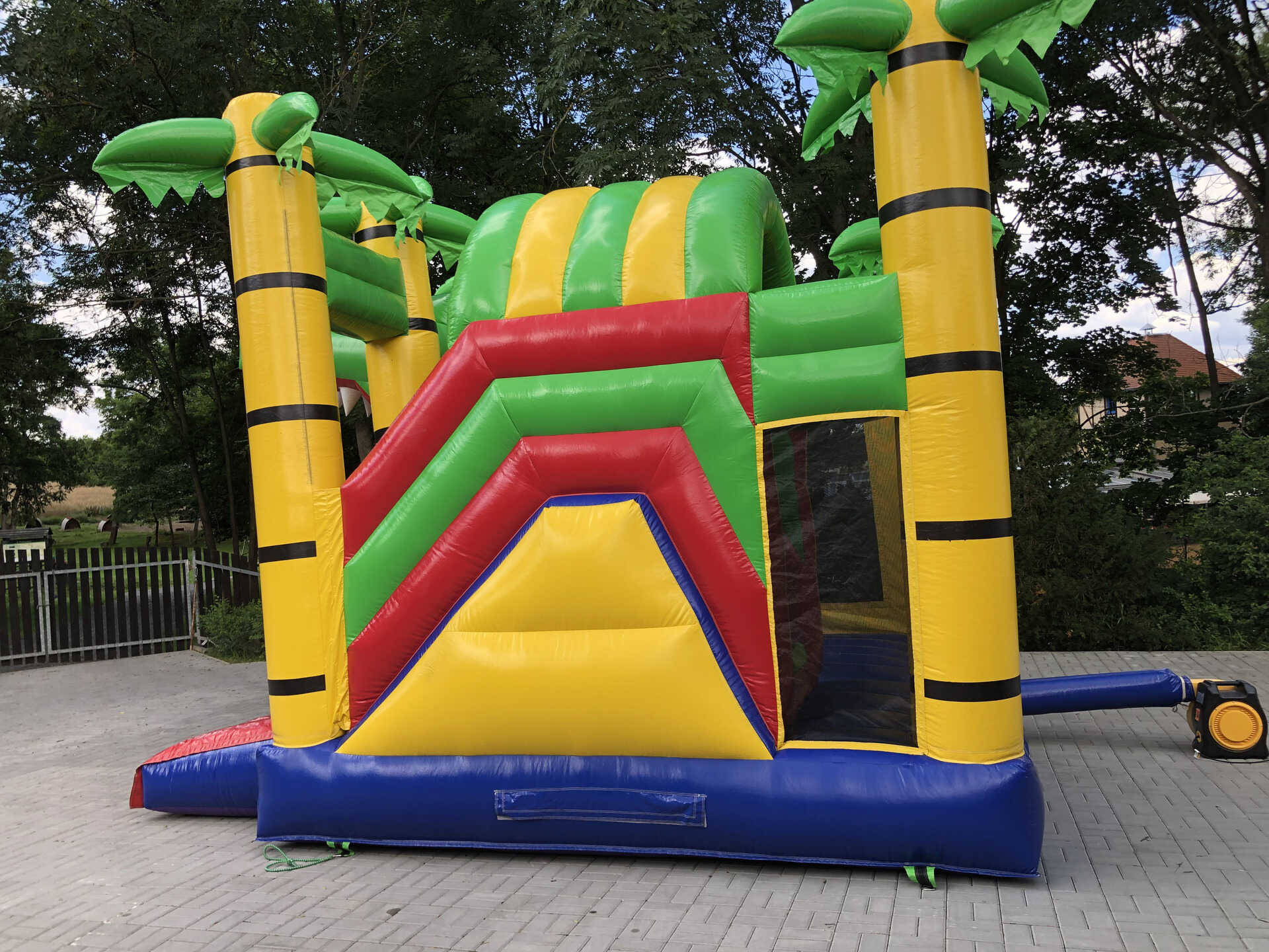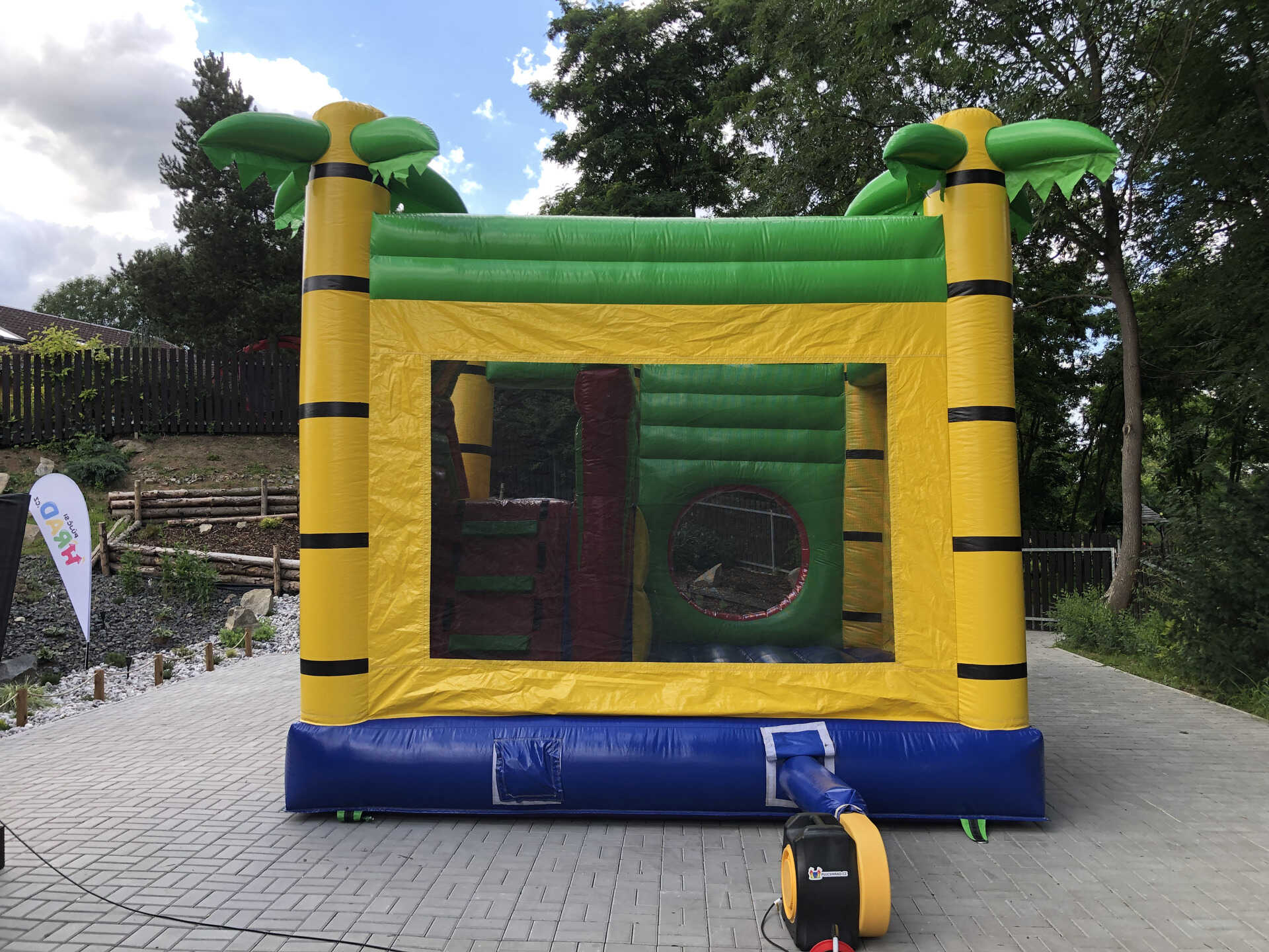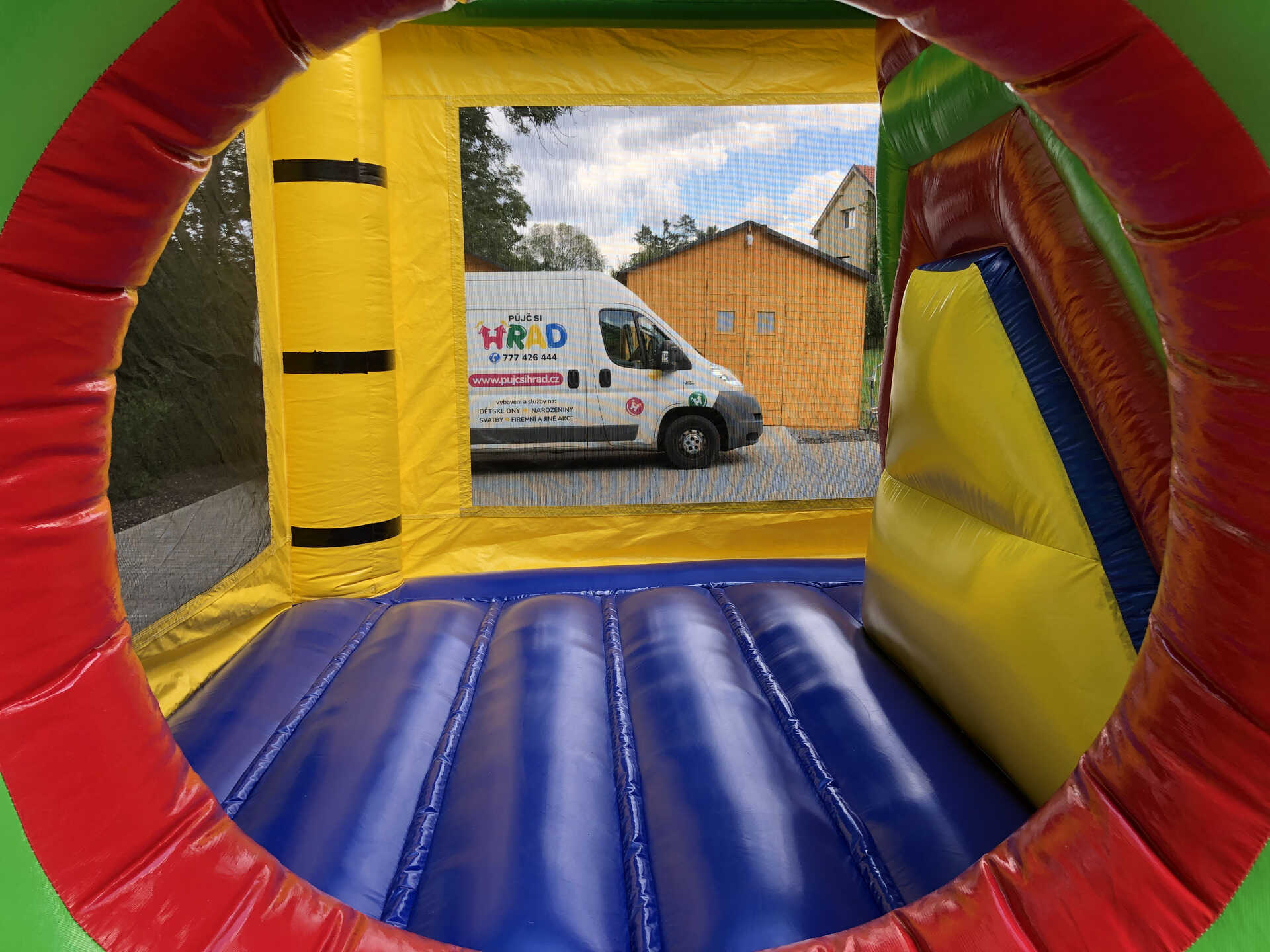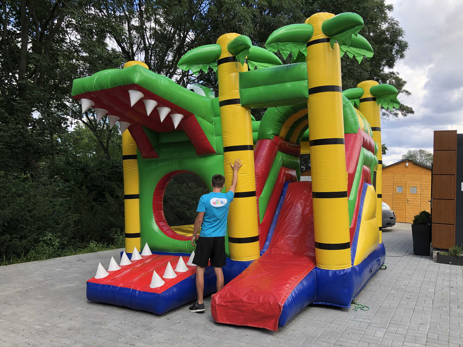 Originální skákací hrad s motivem krokodýla, vyrobený ze silného materiálu, proto je vhodný pro děti do 15 let. Součástí je velká skákací plocha s překážkou a velikou skluzavkou.