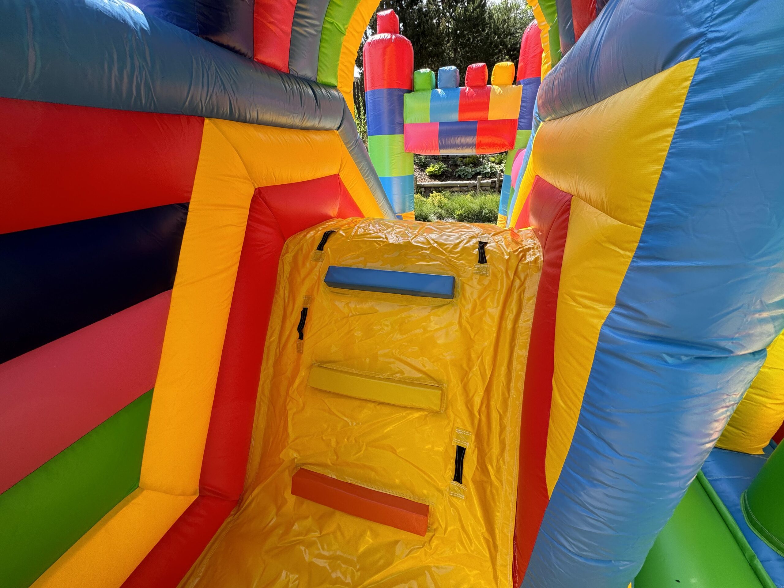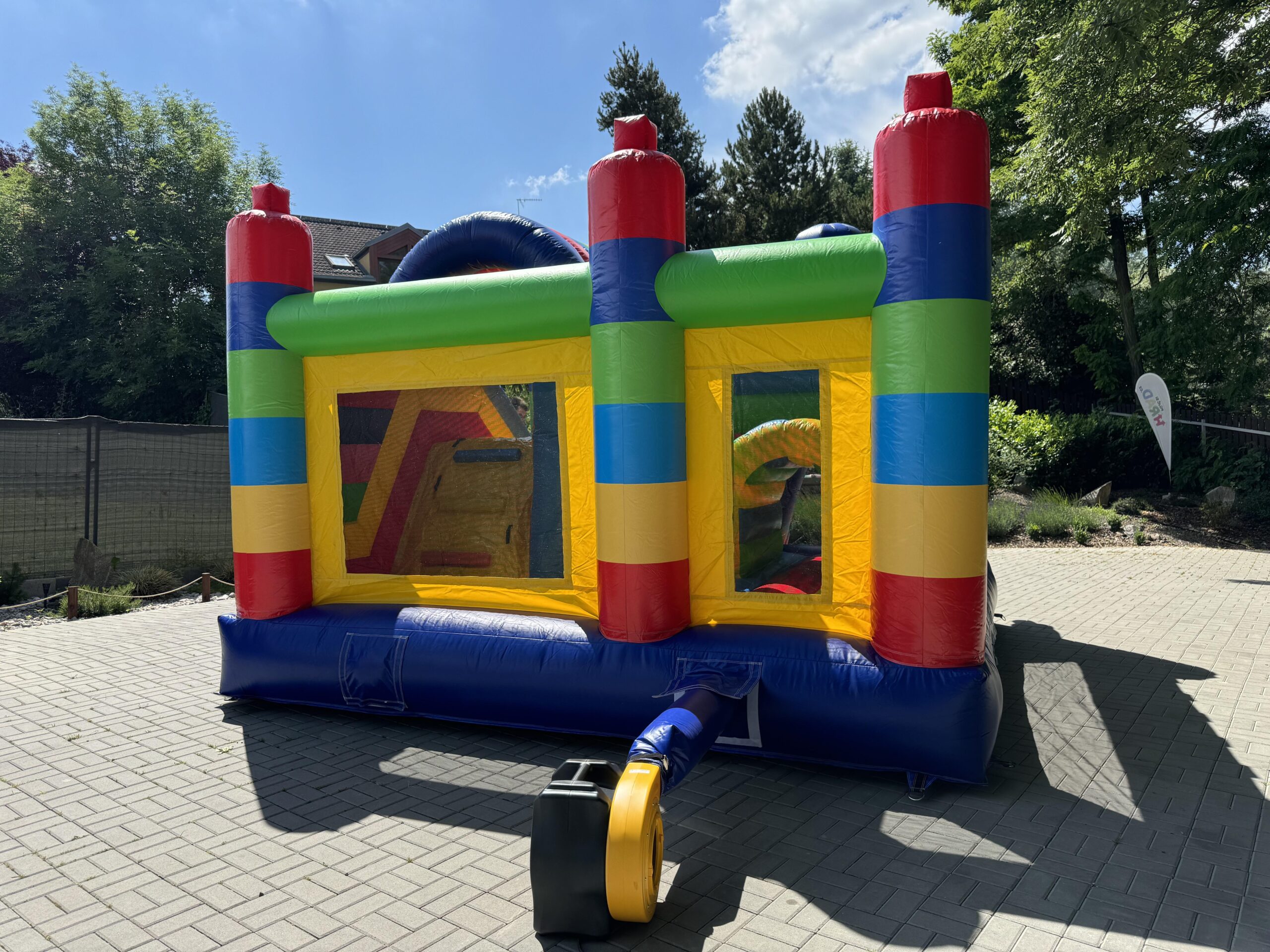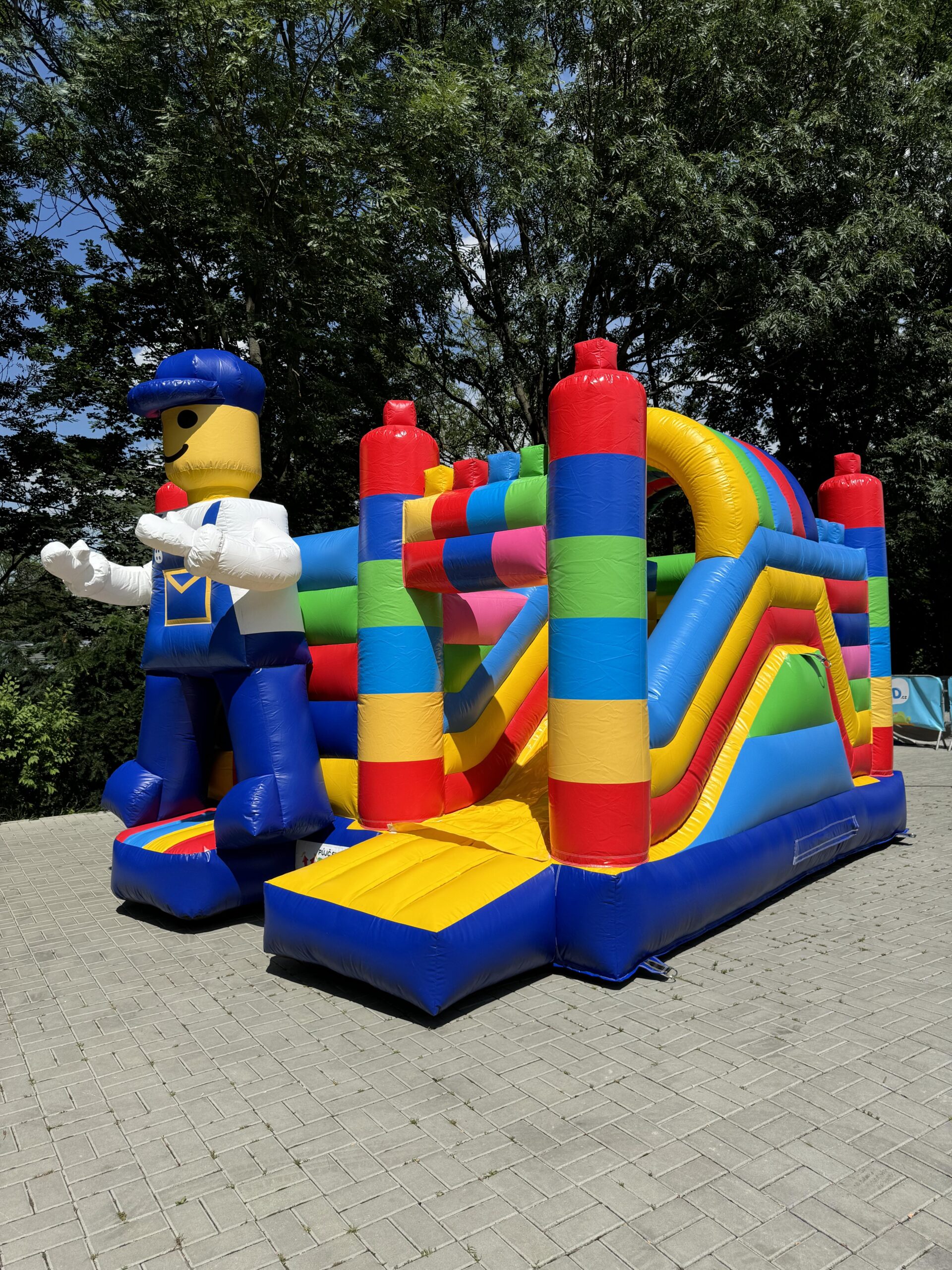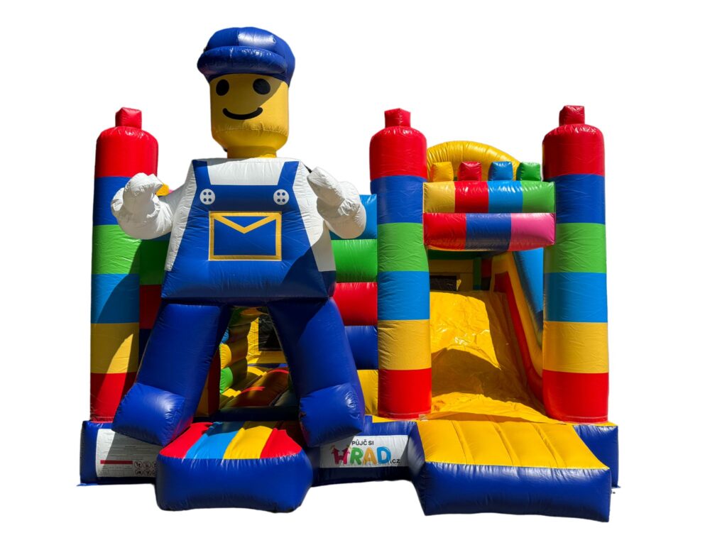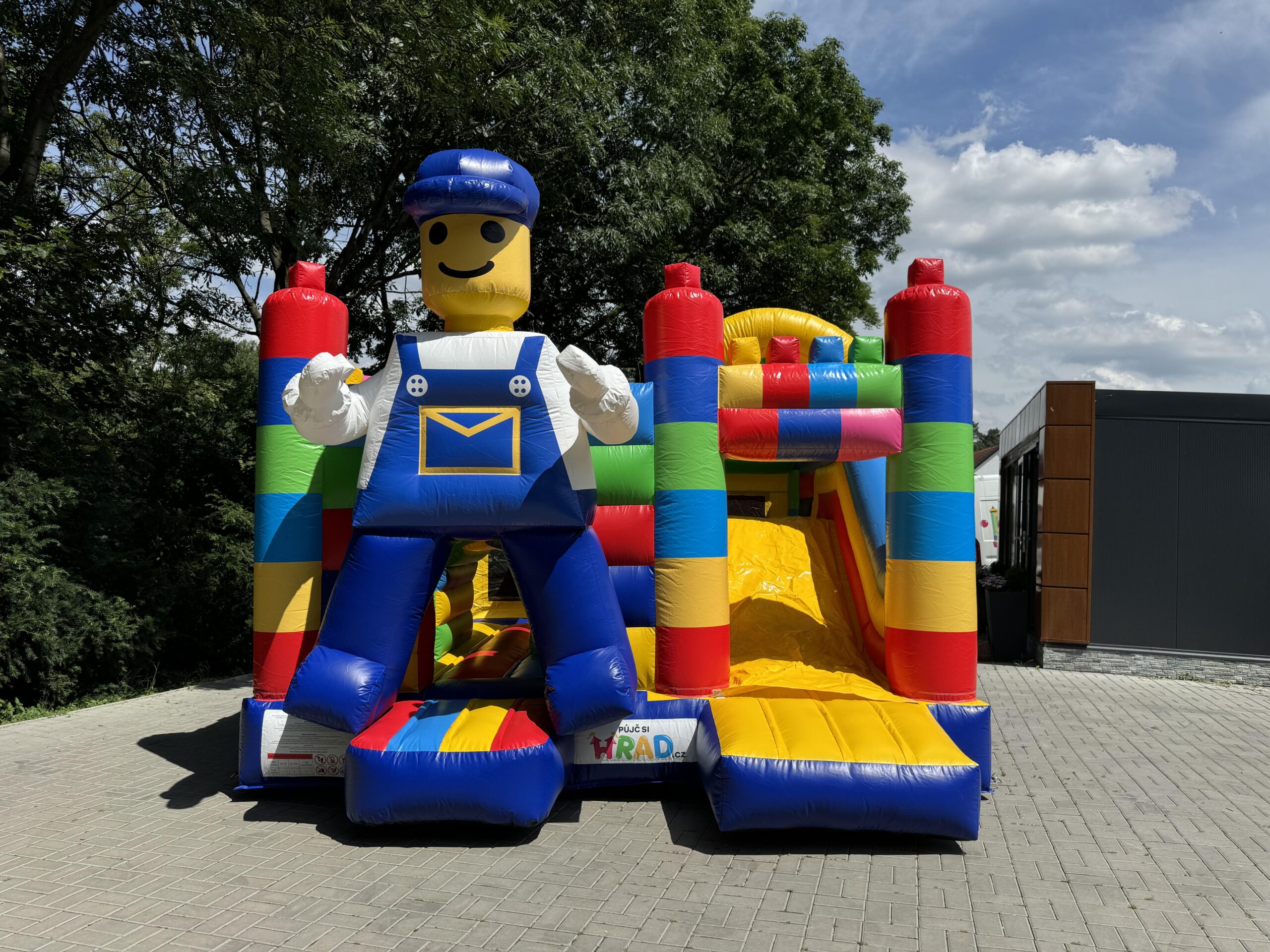 Skákací hrad s motivem Lega. Obsahuje skluzavku, tunel a 2 překážkové prvky pro děti.