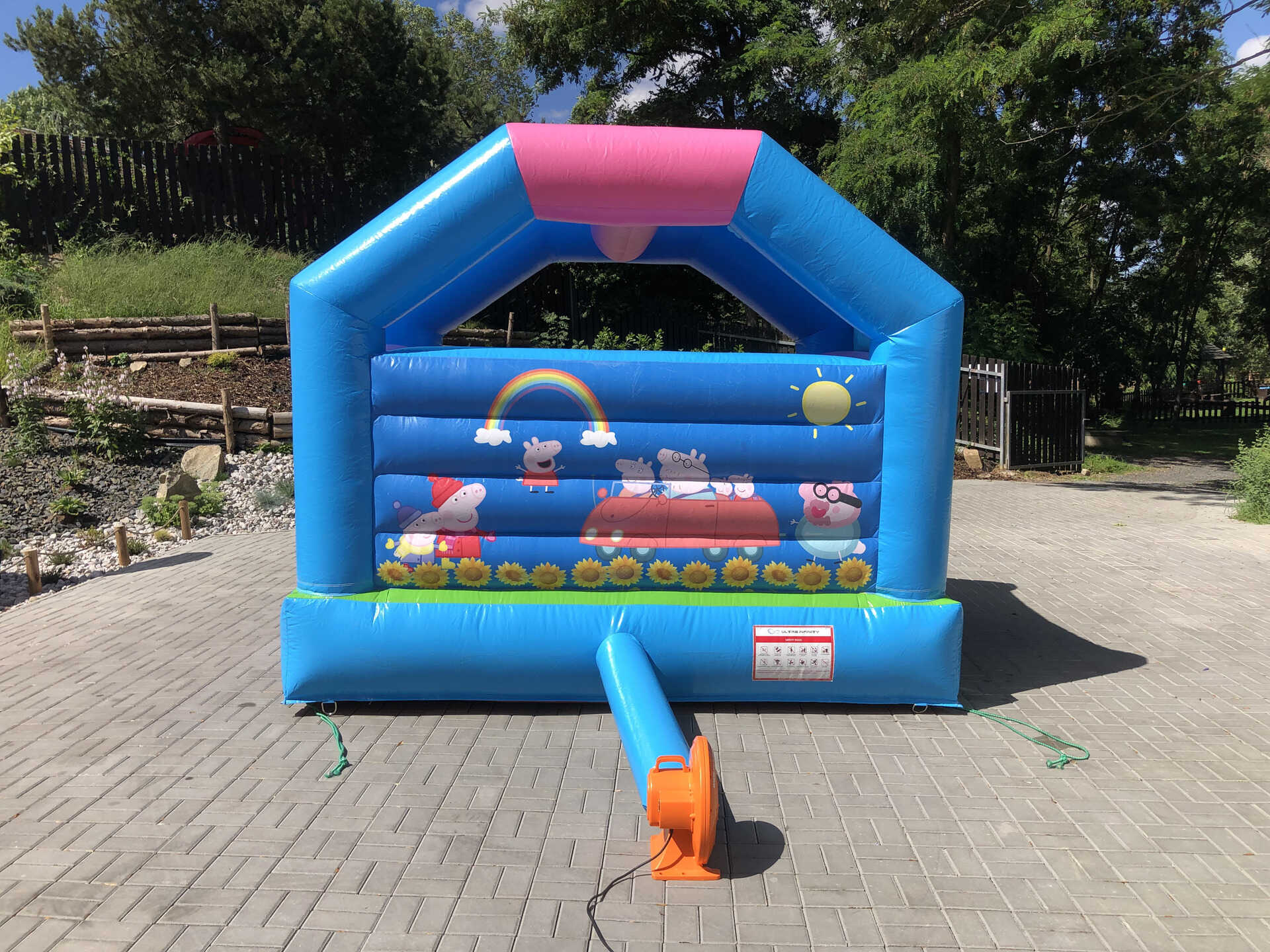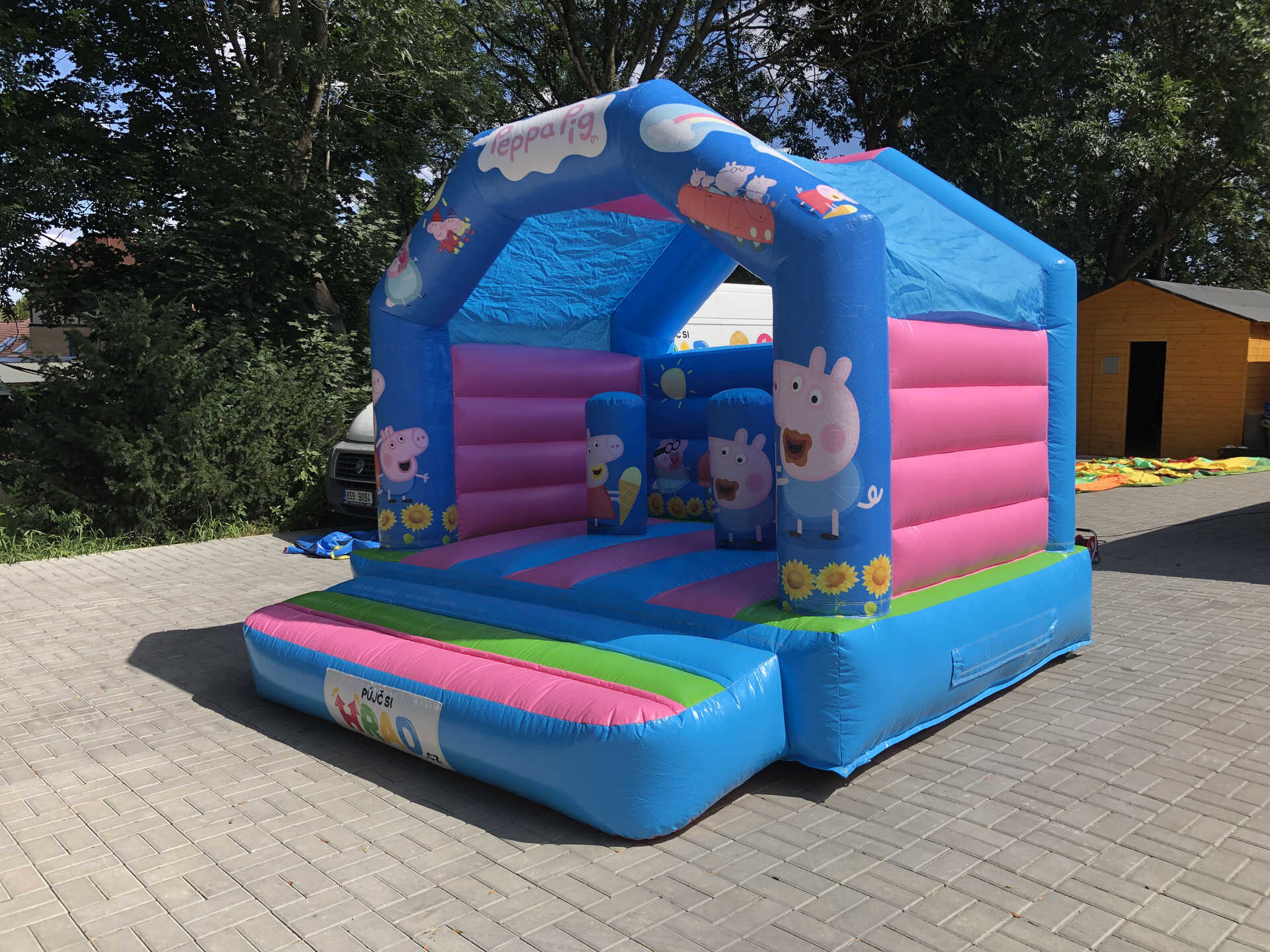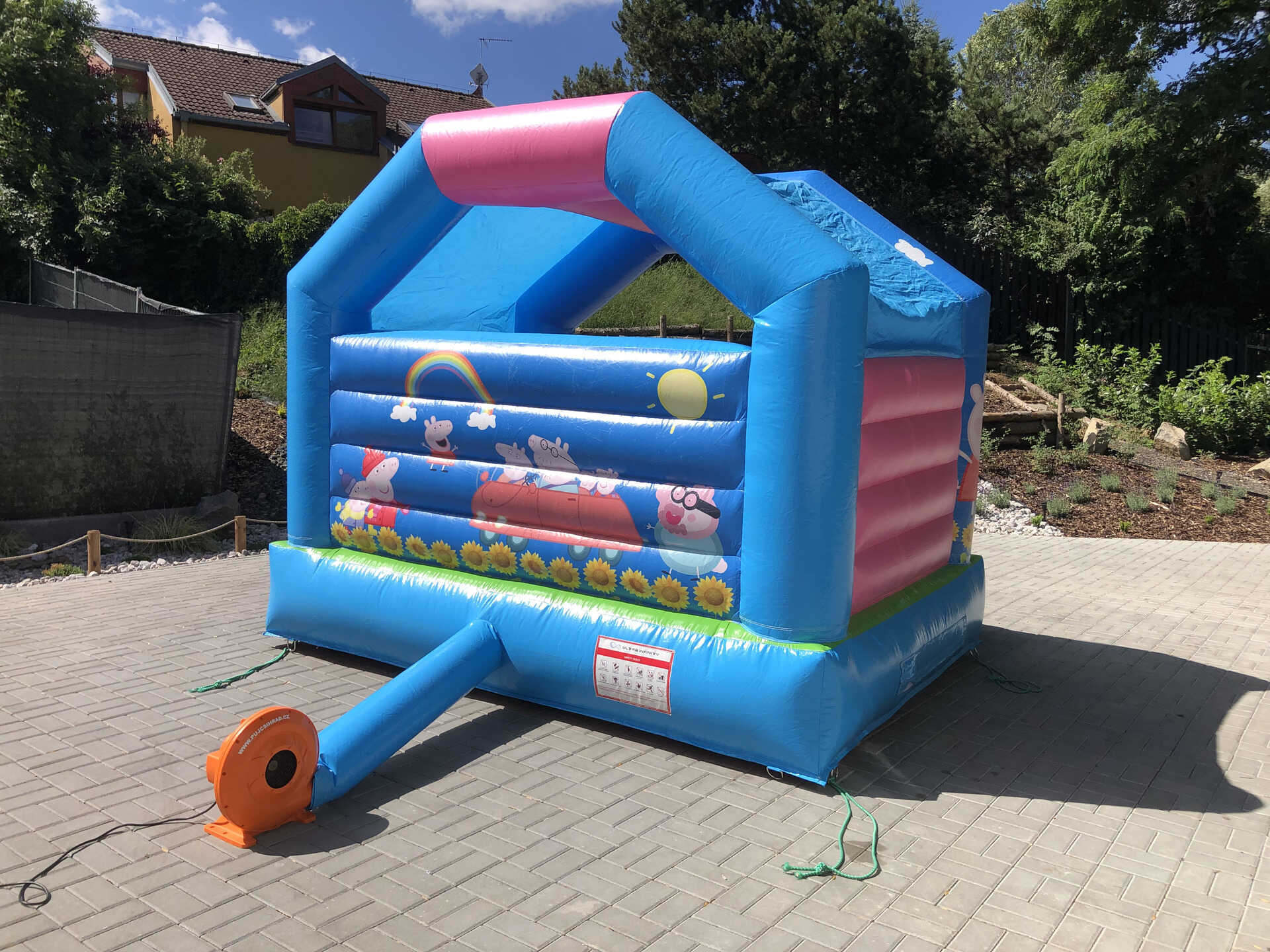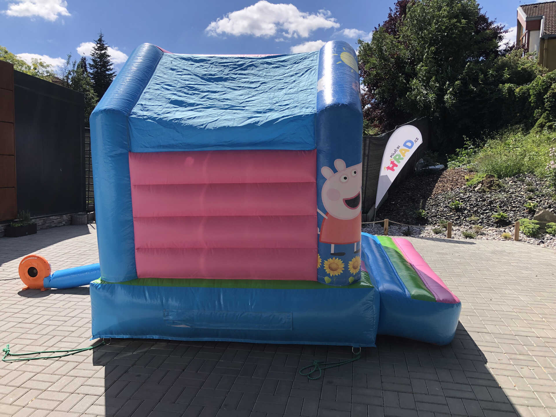 Originální skákací hrad s motivem prasátka, vyrobený ze silného materiálu. Výhodou je veliká skákací plocha s jedním vchodem, takže máte přehled a hrad je ideální i pro malé děti. Hrad má stříšku proti slunci.