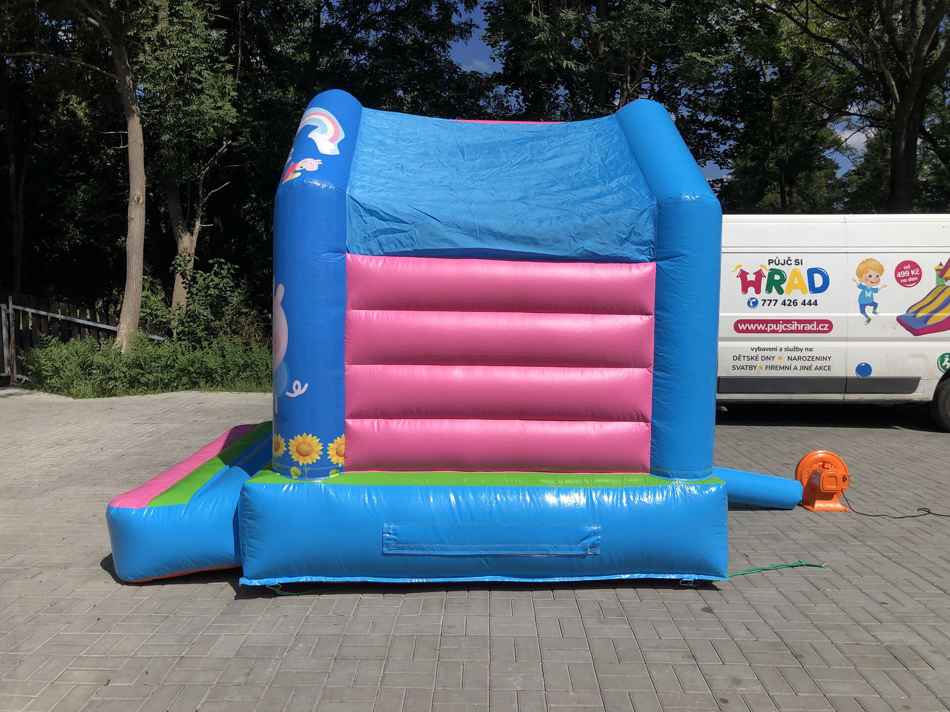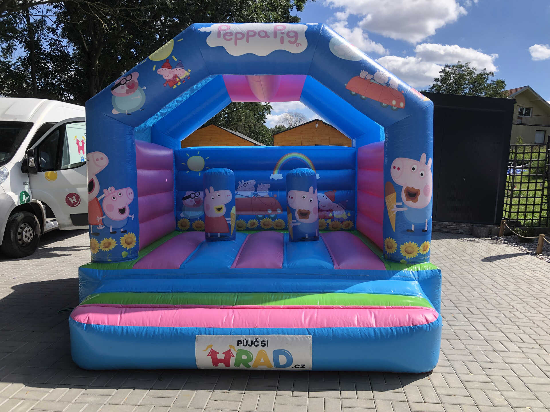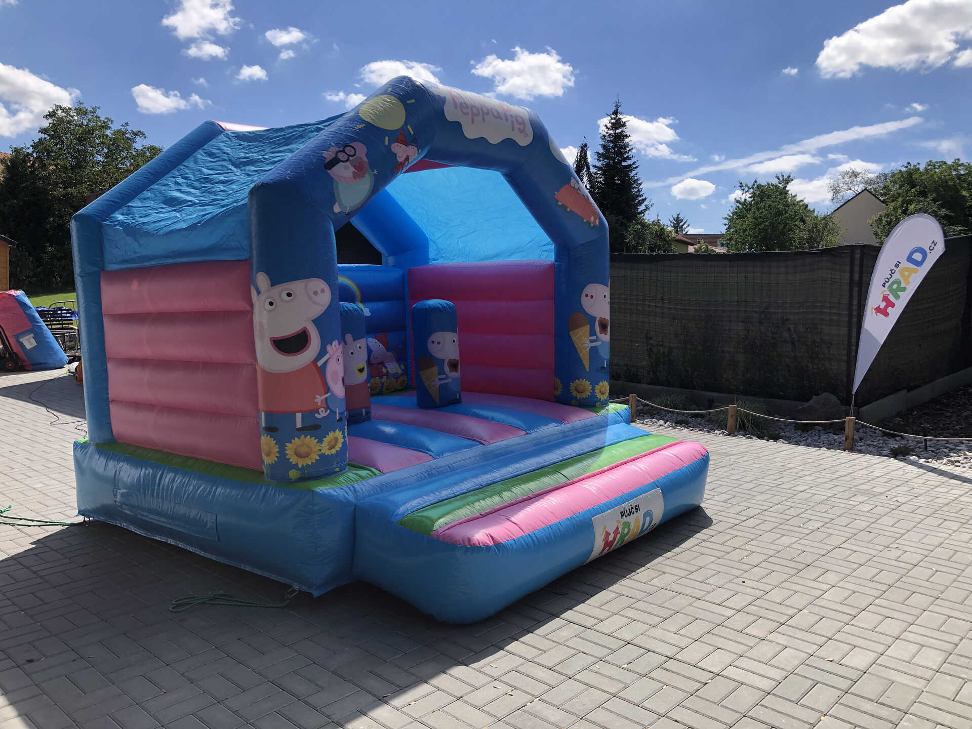 Originální skákací hrad s motivem prasátka, vyrobený ze silného materiálu. Výhodou je veliká skákací plocha s jedním vchodem, takže máte přehled a hrad je ideální i pro malé děti. Hrad má stříšku proti slunci.