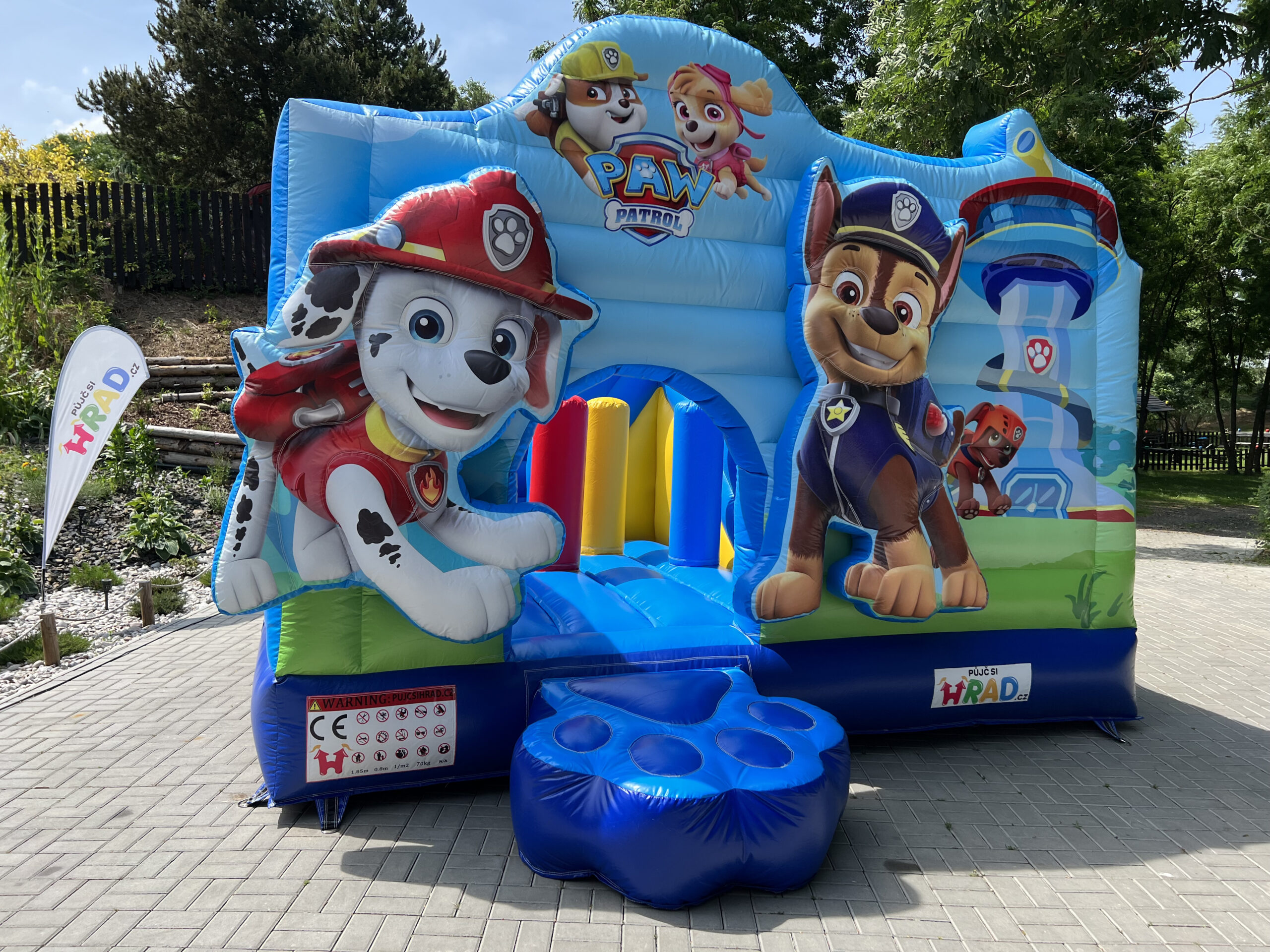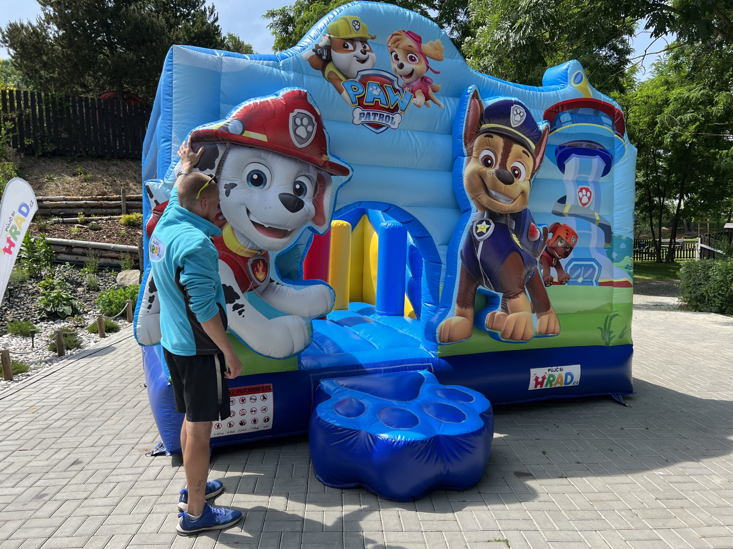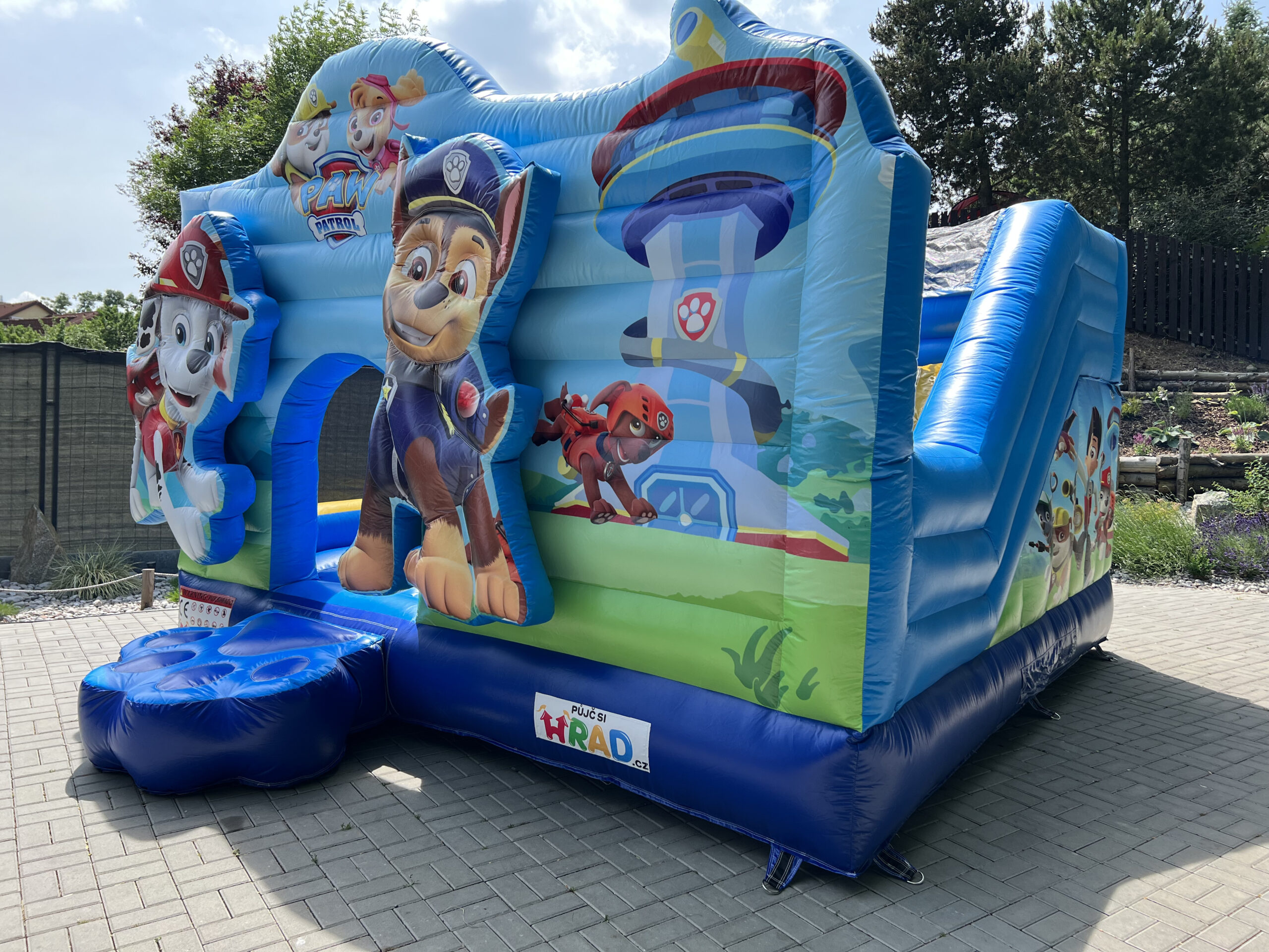 Skákací hrad s motivem PAW PATROL, vyrobený ze silného materiálu, proto je vhodný pro děti do 15 let. Součástí je velká skákací plocha s překážkami a velikou skluzavkou.